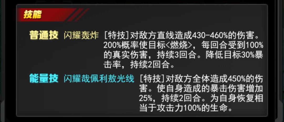 ① 普通技:闪耀轰炸 [特技]对敌方直线造成430%-460%的伤害。200%概率使目标<燃烧>,每回合受到100%的真实伤害,持续3回合。降低目标30%暴击率,持续2回合。