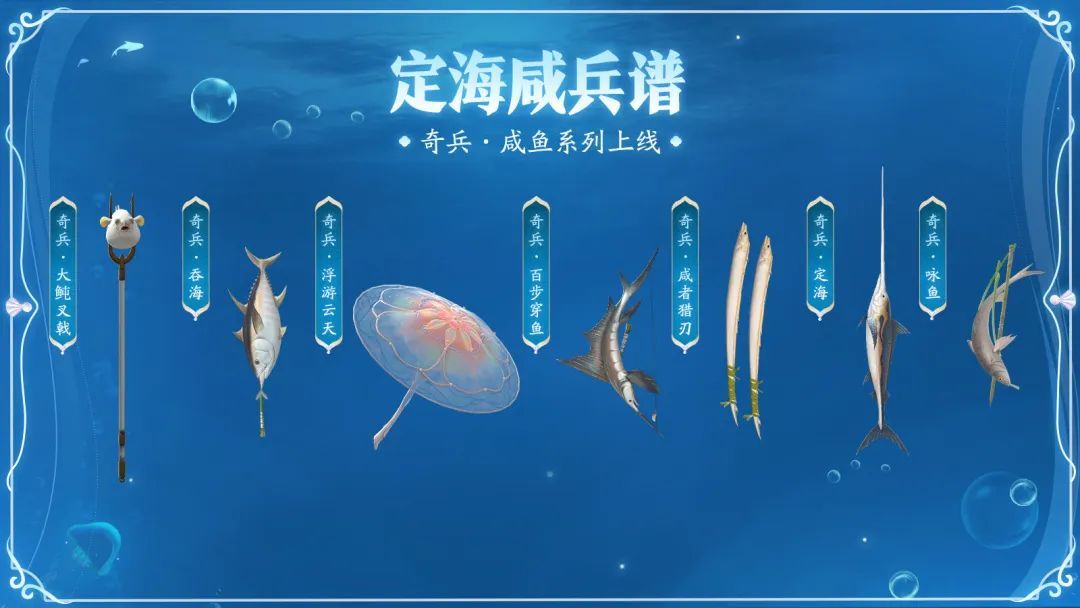 本次海洋奇兵以“鱼”为主要元素,整体活泼俏皮,完美贴合海洋之趣。将极具生命力与灵性的生物与冰冷的兵器相结合,打破对兵器原有的刻板印象,给予少侠在战斗中的全新奇趣体验!