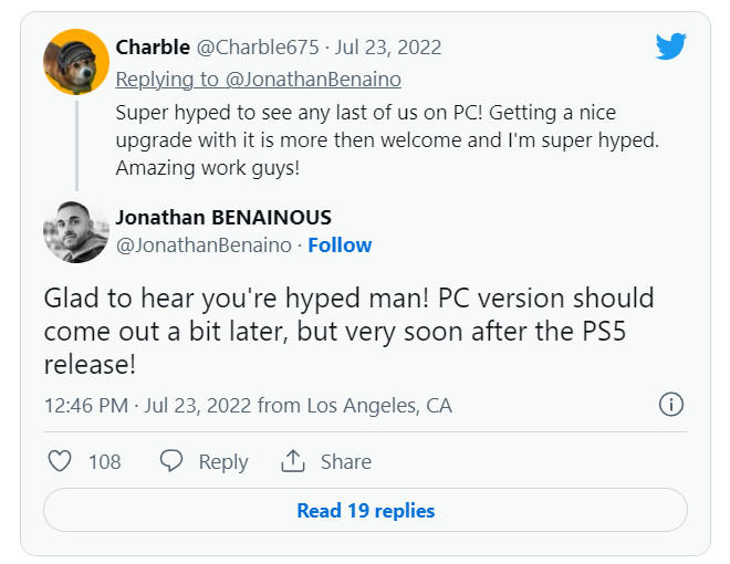 他在回复网友时说:“很高兴听到你这么激动,哥们。PC版应该会稍微晚一点发售,不过在PS5发售后很快就有。”