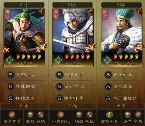 总结:细心的玩家会发现这个队伍在前期的等级方面基本上都是领先对方的,可以说这个阵容可以直接用姜维赵云菜鸡开荒,通过调整武将兵种和战法进行打地的克制,目前姜维和赵云在兵种适性方面还是很不错的。求稳的情况下,12级四,17级五基本上都是可以过的!