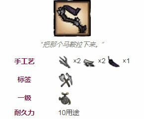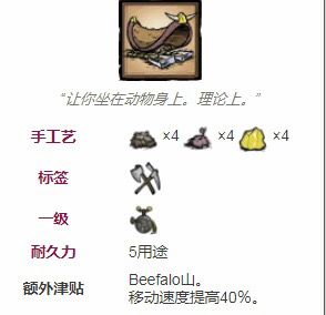 顾名思义,用于驯牛过程中,如果长时间不能顾及到牛,要把它扔到舔盐器时,顺从值降到40%一下会甩鞍,如果这个鞍比较贵或者你心疼,可以用取鞍器把牛鞍取下来而不消耗牛鞍的耐久度。制作简单可以用10次