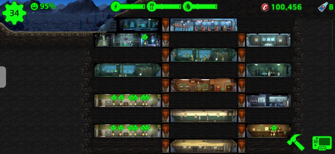 5.存钱钱,当养好12人满e后,应该可以刷到5e图纸了,但是升级装备房要55人,这个时候就要靠爆人口去升级,有几个方案:①升60人口开核电站,升武器和装备房2级后,迅速踢人到35,然后造核电站和5e装备,平稳发展,这样要存的钱钱比较少,大概十几万就够了。②直接爆人口上100开核子可乐(然后再降回35人口),这个有点难度,因为要爆几轮人口,期间会出死爪和蝎子,保护好满e小人很重要,这种比较极限,存的钱钱也更多(开3级武器装备房就更多了),估计没个50万+扛不住消耗吧![[嗒啦啦4_捂脸]](https://img.tapimg.com/market/images/9ee8426de6eb6863c01e62c14ca8eef7.gif)