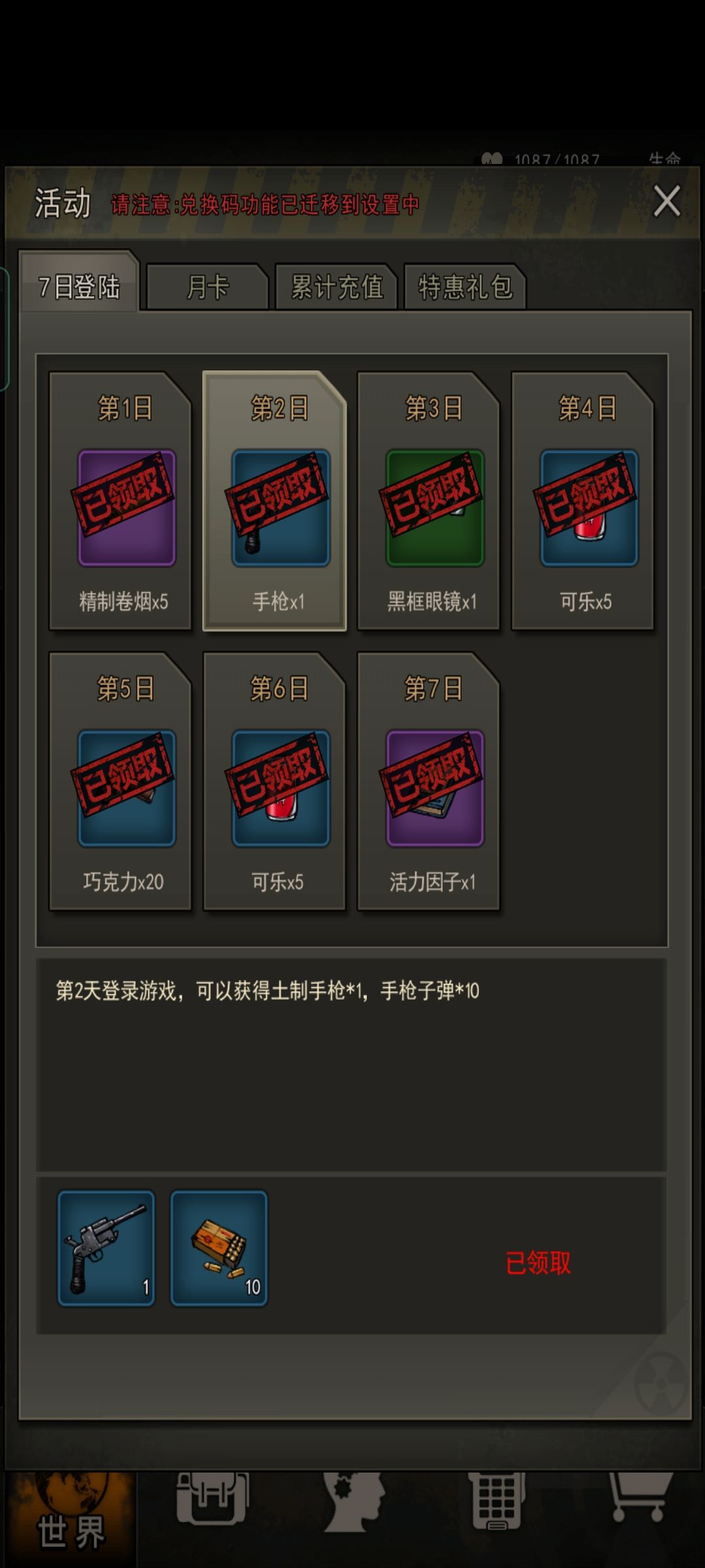 在这新手七天礼包里面,第二天就送了一把土手和10发子弹,也就是说,不管你有多菜,去图二是有“手”就行了。(还可以分解了换铁块)