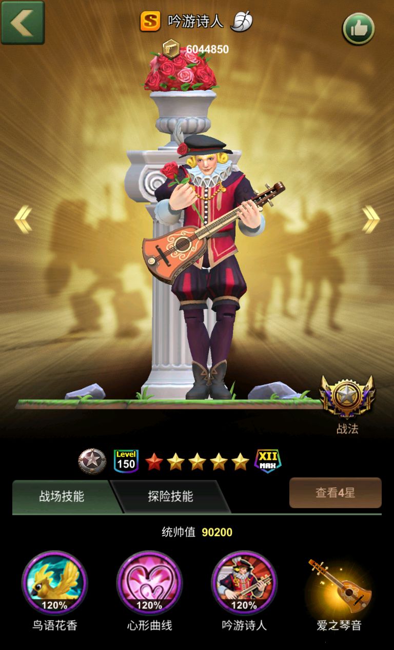 吟游诗人这个军官四个技能全是日常都会用到的,对军事、采集或者出征的提升非常显著,是性价比很高的军官。并且吟游诗人只需要委任在军事部门,不占用出征栏位还兼得三种技能加成,综合看来算是每个人的必备军官!