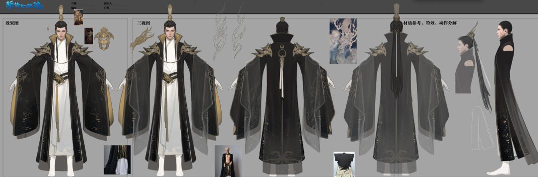 不过,在此次的案例中,美术上的合作实际上是遇到过一些难题的。比如,我们一开始缺乏了不少和影视剧组对接的经验。以前,美术同学对电影美术的了解只能说浮于表面,觉得往大气的感觉去画,效果炫就是高端了。但实际应用到影视内的制作往往需要考虑很多方面的问题,比如一些服饰的设定跟游戏设定区别就很大,道具服饰最终要做成实物的话,就对对原画要求较高,特别是三视图和细节说明要尽量详尽。一些特殊材质和过于繁琐的细节,到了实物制作环节往往会发现效果不佳,这取决于对面料材质的理解、剪裁合理性、道具投入费用等多种因素。现在回想起来,当时的一些设定和服饰的实体效果,还是有很大提升空间的。