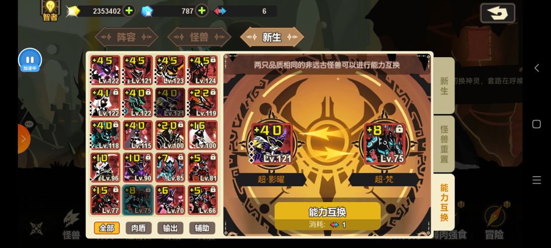 具体操作如下:例如你的新生练度较高,就可以先用一个互换结晶与三幻神之一的进行转换