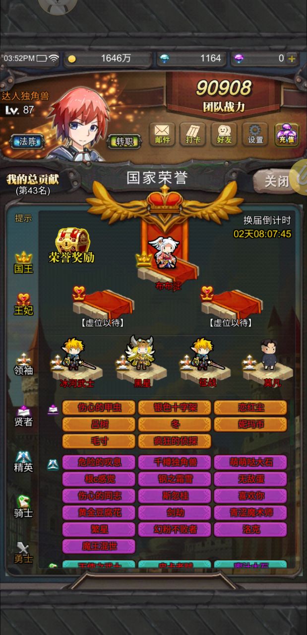 勇者大作战手游中一共有三个国家,通过魔法师的占卜加入其中一个国家,选择随机加入可以获得额外奖励。国家职位会定期换届,根据每个成员国家贡献来决定。成为国王的话还可以自定义国家名称。国家贡献主要通过国战和捐献获得。