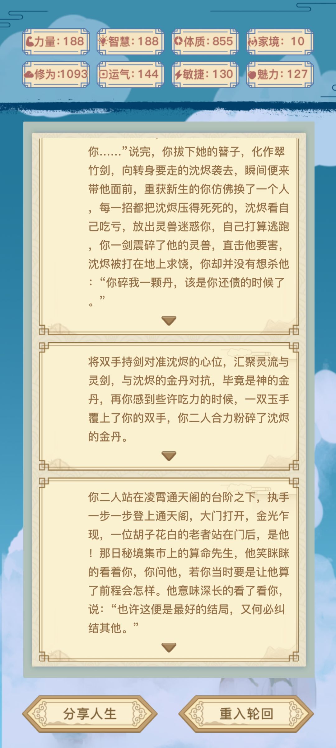 4.前期要修为(不然可能老死),后期渡劫就是要基础属性,修为在799岁前达到1000即可。渡劫很重要也很难,具体看我下方给的图。