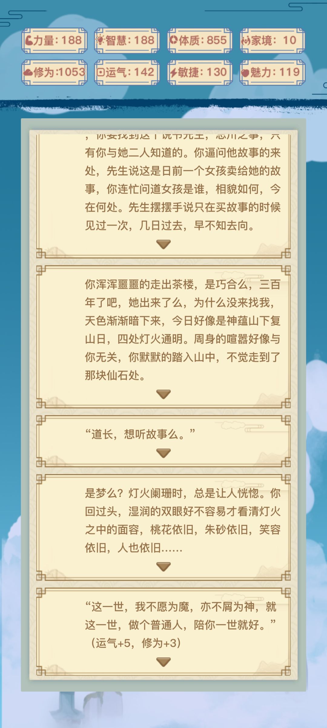 5.最后一点,其实在我们修仙之时,也应当关注剧情,有些十分感人,有些十分滑稽,还有些引人深思。特别是白洛竹与我们的主线剧情,相当于一本小说大纲了!不妨多看看这成仙道路上的风景🙂