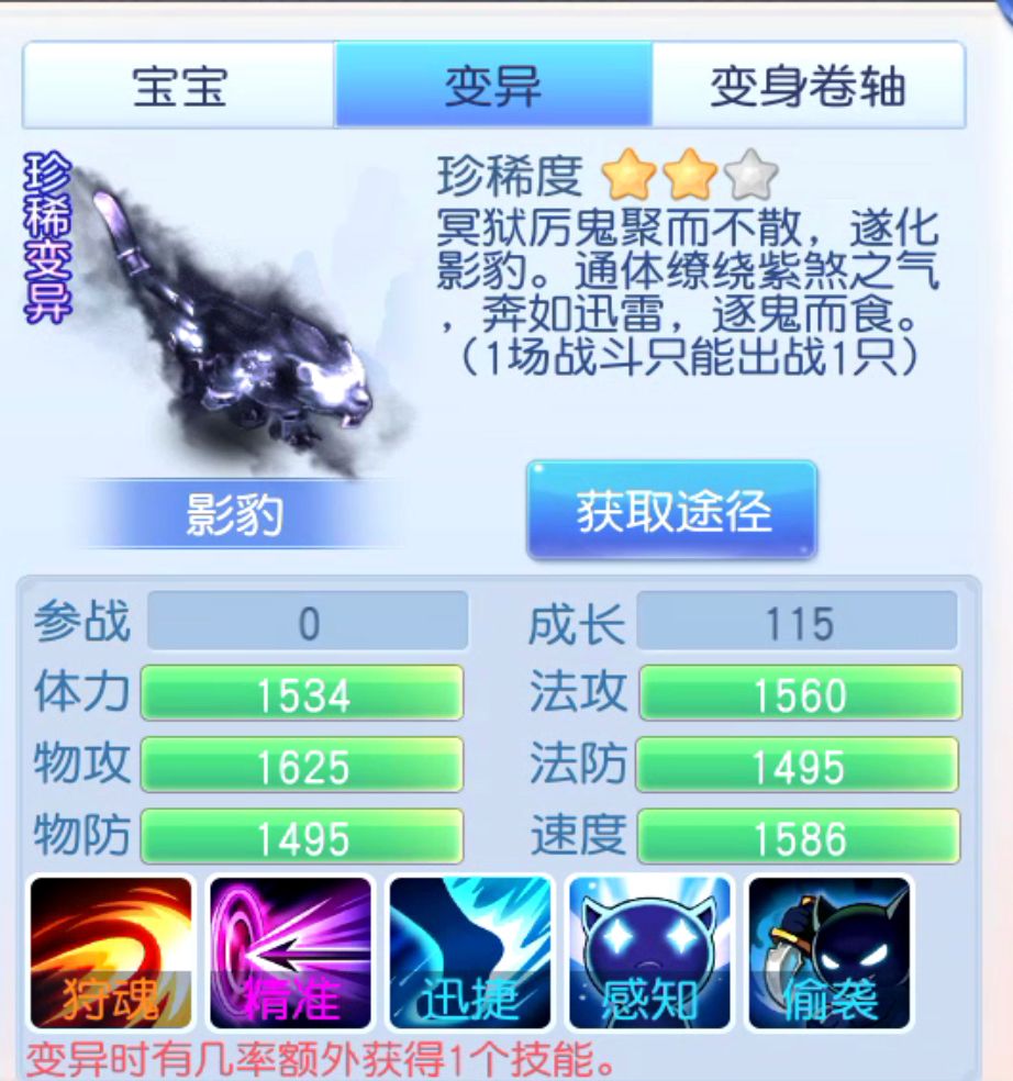 全游戏唯一一只携带主动技能的六技能物理宠物!那就是影豹,一只颜值实力共存的超级二星宠物,对于输出宠物来说,多上一个技能,可以说是天差地别,所以说这只宝宝,哪怕他的主动技能有概率会休息,但是依旧超越很多物理三星宠物,毕竟概率休息这个问题在灵武和运气的加成下,其实已经算得上是很低,而且主动技能狩魂还是百分百连击,强不强你说。