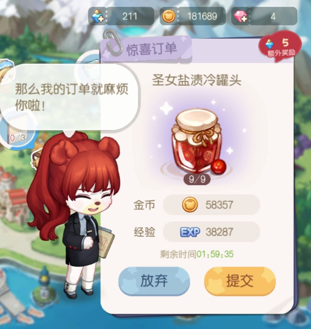 并且你每做几个(好像是3个还是5个来着)普通订单任务就会刷新出一个限时订单,这类订单往往要求更高一些,制作的物品大部分涉及消耗稀有材料,但是带来的金币和经验也是非同寻常的,提前屯好资源不乱用(这也就是为什么不推荐做世界任务,都用完了可能完不成限时订单)可能就以超低成本获得巨额收益!(下图是我28级接的限时,料理制作成本低)
