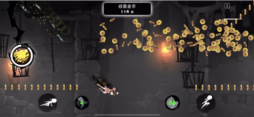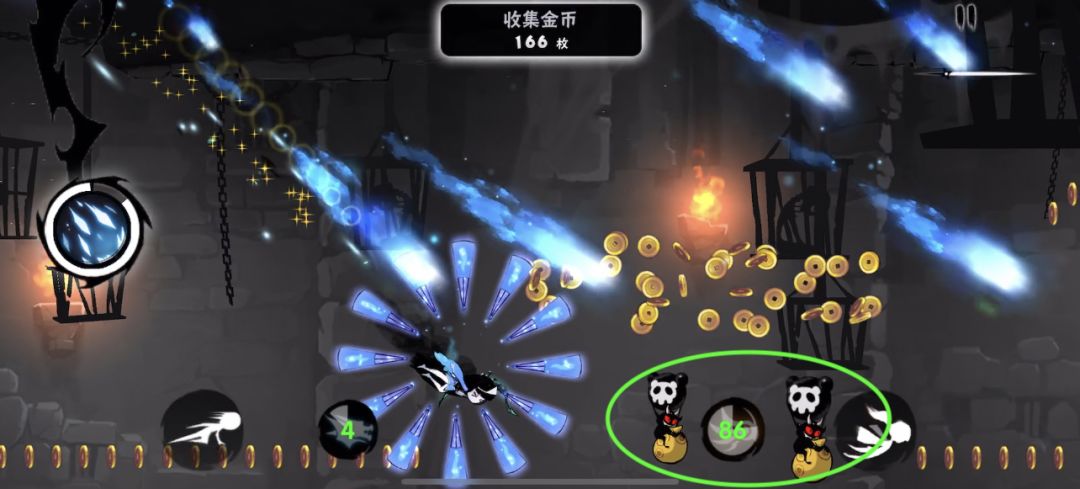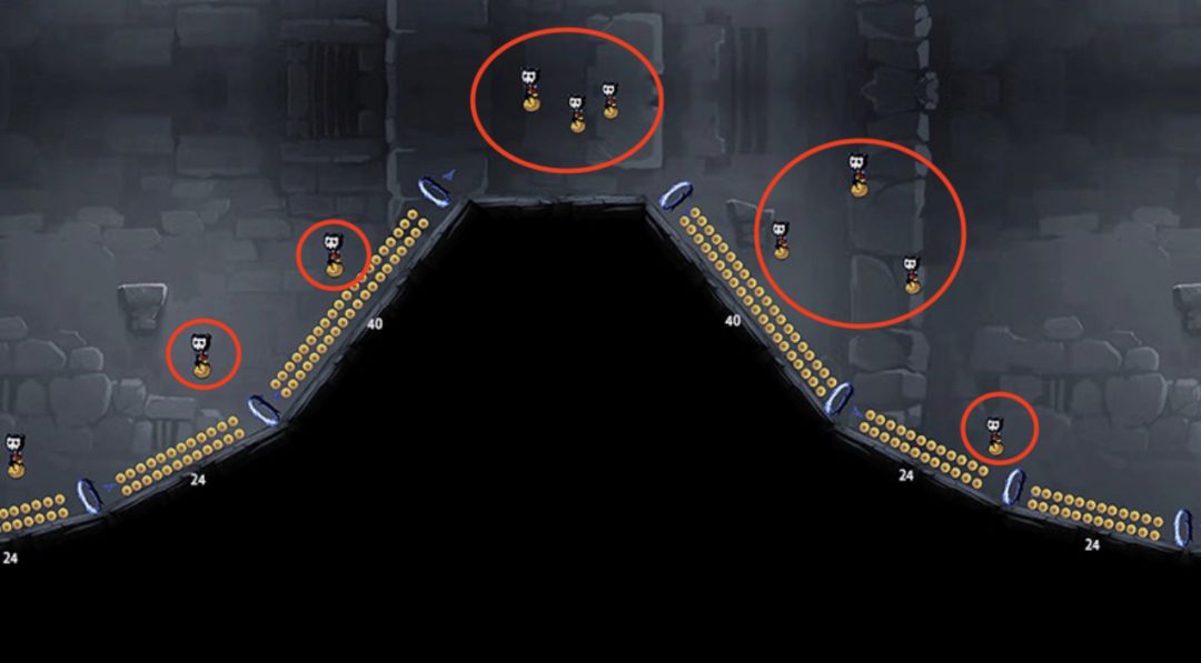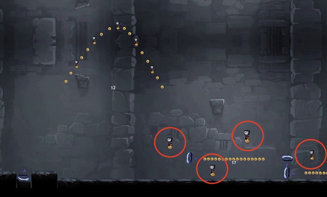 如上图,雷椒在上坡路段最后一个传送门前开大,那她的初始大招清屏是能够解决掉图中所有红色圈圈中的钱袋子并且不会漏金币的。