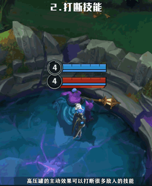 炼金高压罐的主动效果能打断很多敌人的技能,比如青钢影的E(3)、盲僧的二段Q(1)和W(2)、蔚的Q(1)和蕾欧娜的E(3)等等。但炼金高压罐不能打断无法被阻挡的技能,比如墨菲特和蔚的大招。