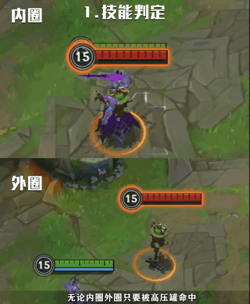 无论外圈内圈,只要被炼金高压罐命中,被控制时间均为0.5秒。按下技能键后光环的动作很快,但达到最外圈会有短暂的延迟,所以我们可以使用“罐闪”来控到更远的敌人
