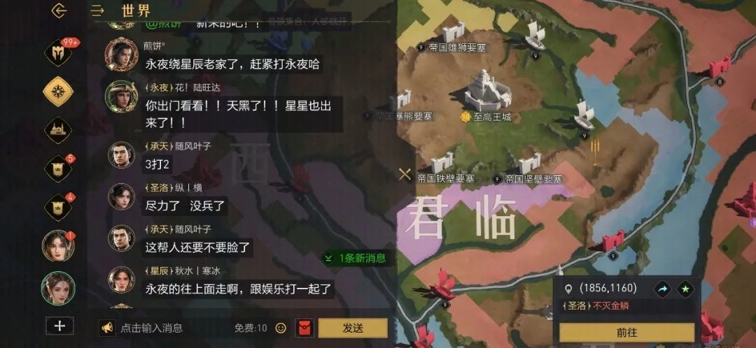 7月12日,各盟陆续进入君临,战事的中心也很快转移至此。次日,以【揽星辰】为首的4区阵营,在君临东部迅速建立起对战【不灭】的阵地。而【娱乐】则是在君临西部,不断以扩大版图的方式压迫【起源】,【花满月】更是配合扩容盟【风满楼】缓慢将君临北部逐渐蚕食。整个君临,留给【不灭】、【起源】的地盘仅有君临北部不到三分之一的土地。