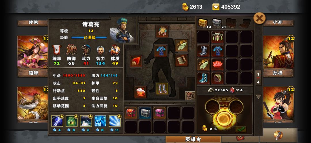 单诸葛刷开阳(低配),在装备这块特地选了半天调试了几局,最终确定诸葛智力130最低120可以单刷这个图,当然没有火扇的小伙伴也不用担心刷不了,可以用九天雷仗来代替,地图里还有两个10点智力亭子可以吃,单刷最好带乌龟分组,利用乌龟的冰冻来冰住远程敌人打起来会很轻松。装备实在困难的萌新也可以通过孙权来招无当,时间方面可以拖到第五周,到时候拿着100+的无当打这个就很简单了,当然如果要速刷最好还是最低准备两把火扇。