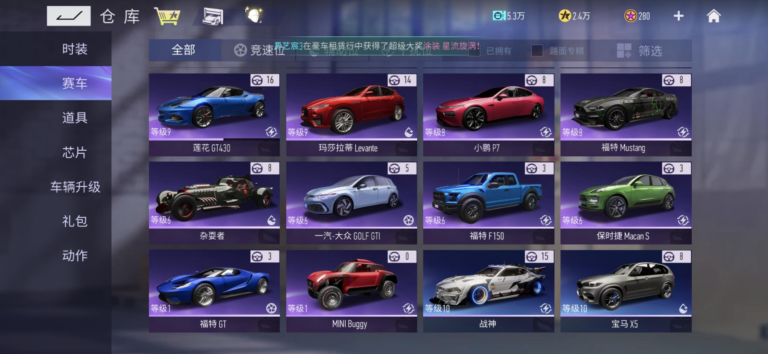 莲花够了,红玛莎差2个满级,杂耍者、保时捷、Mustang、F150差1个到9级,高尔夫、小鹏差2个到9级