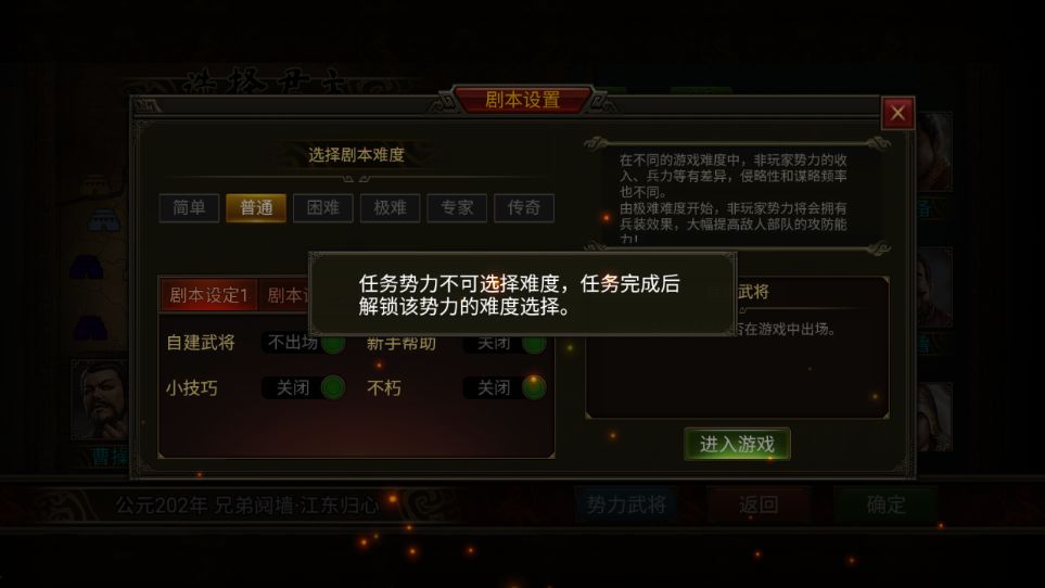 每次开局感受都不同,所有势力都会重新洗牌,充满刺激和未知性。而随着剧本进程的发展,名将汇集,不同势力间的平衡将会被打破,整个战局都朝着完全无法预知的情况进行,加上更加自由灵活的难度选择,让大家在激战剧本中战个痛快!
