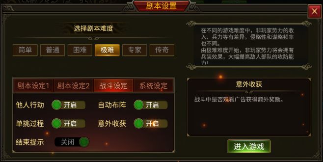 以往的剧本中,我们有“简单、普通、困难”三种难度,但仍然有玩家希望能有更高的挑战,因此在激战剧本中,我们会首次引入“极难,专家,传奇”三个新难度,欢迎各路大神前往挑战。