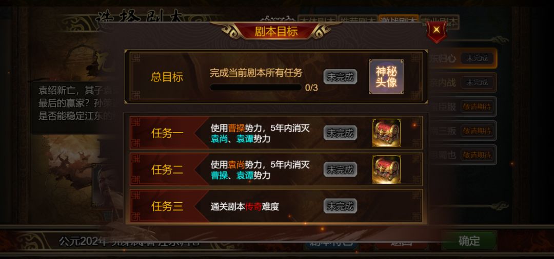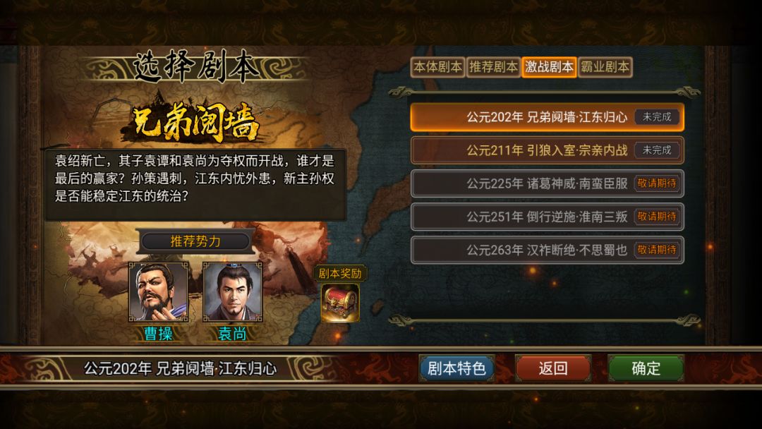 我们为本次五个激战剧本设立了不同的“剧本任务”,玩家可通过扮演指定势力完成剧本拿到包括自建武将头像、金刀、玉符等在内的首通奖励 !