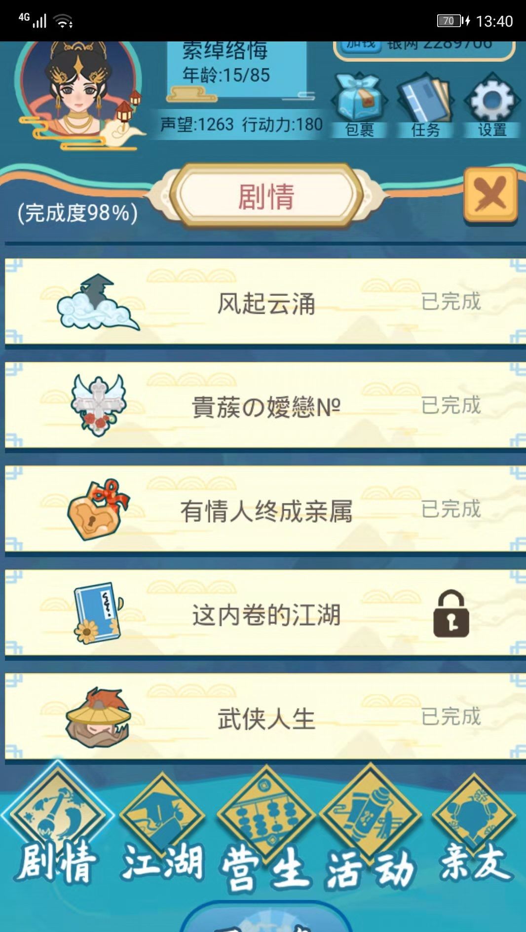 2、朋友。可以在【江湖】板块结识。可以学技能,结婚。