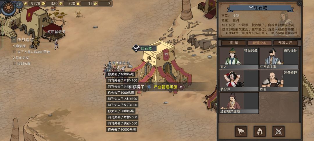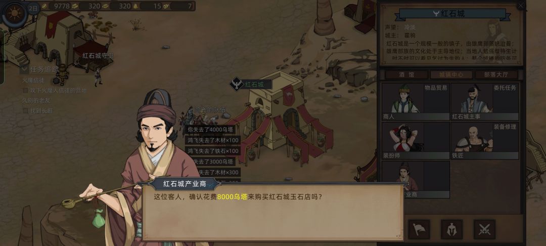 先购买红石城产业铁匠铺升满,发20级装备,然后购买玉石店,把钱花的剩一两千