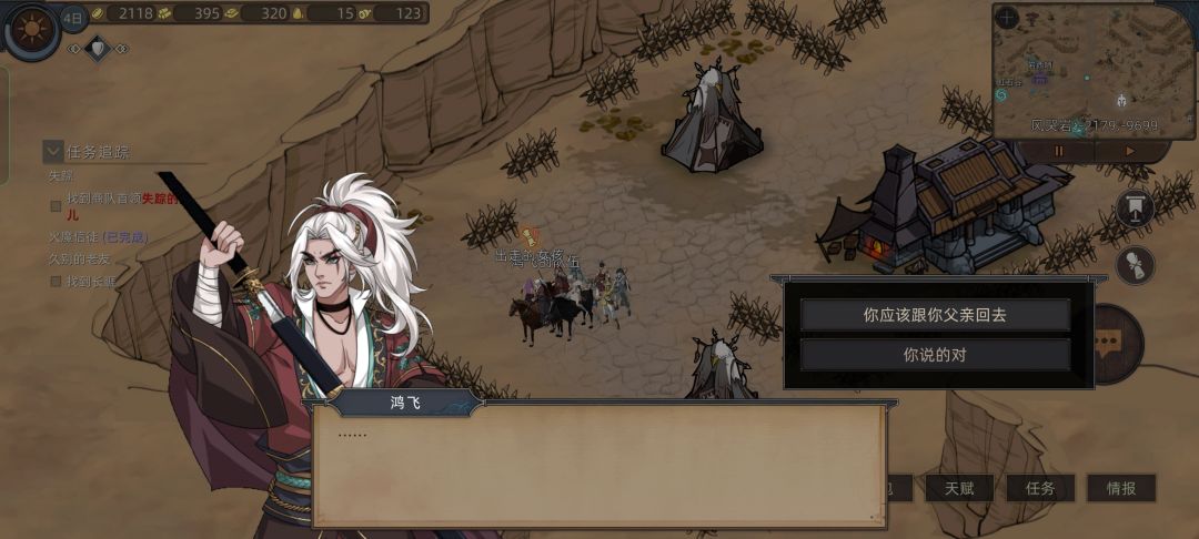 注意这里打完营地一定要选让女儿走(孩子大了可以自立了,也需要自由,所以对不起了商人大叔)可以多拿女儿的一个天赋点,在本不富裕的沙盒模式,能多拿天赋就多拿天赋