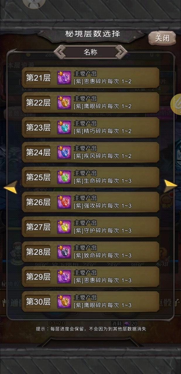 秘境探宝是神石的主要来源,秘境探宝需要消耗秘境骰子,每次投出随机点数前进,也可以使用定点骰子前往指定的位置。在秘境中每层掉落的神石碎片各不相同,可以根据自己的需求选择特定的层数去刷。另外,开通3年卡还可以自动前进,解放双手。