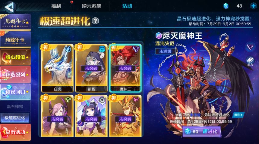 ⑶噬日后羿:单体伤害很高,一般是凹伤害副本的。超进化之前还需要去起源商店换个后羿,然后才能超进化。资源多可以拿,新手不是很推荐拿