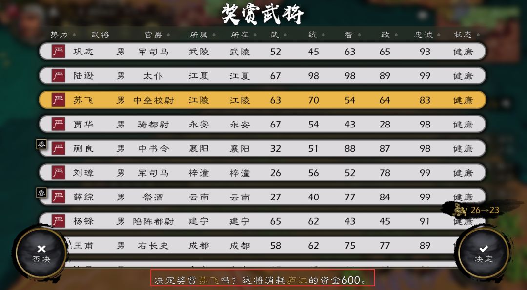 老帝看到主公们在反馈探索很难获取到提升忠诚的道具,希望可以通过金钱来提升武将的忠诚。虽然我们对忠诚度下降以及探索概率进行了优化,但谁让老帝“宠粉”呢。奖赏功能已经安排上,现在可以通过金钱来提升武将的忠诚度了。