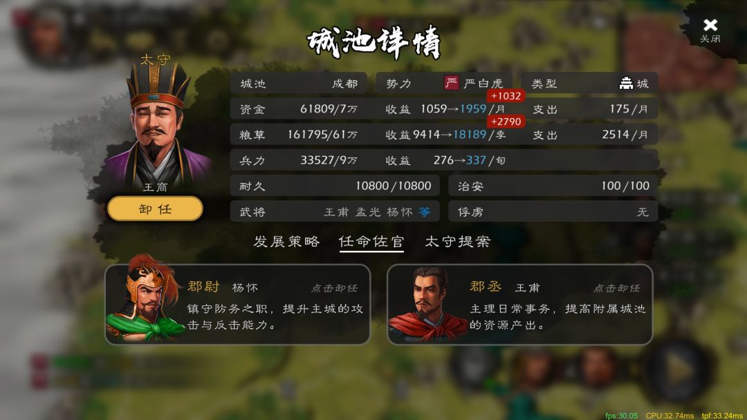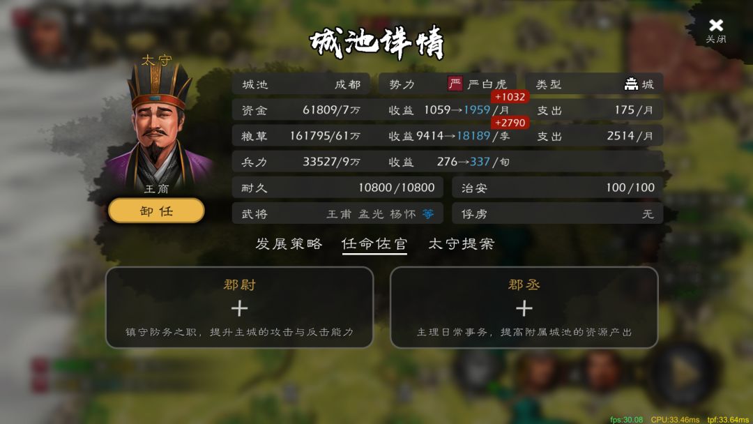 在城池详情中新增佐官,郡尉与郡丞。郡尉可以提升主城的攻击与反击能力。郡丞可以提升附属城池的资源产出。再也不用担心多余的武将没有用武之地了。