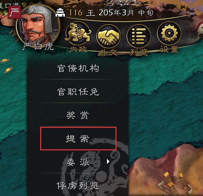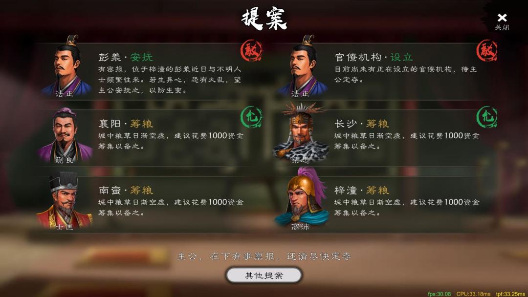 提案是一个新的功能,可以在提案界面中看到军师提议和来自不同城池的太守策略。选中提案后可以选择是否完成,点击“其他提案”可以更换提案内容。