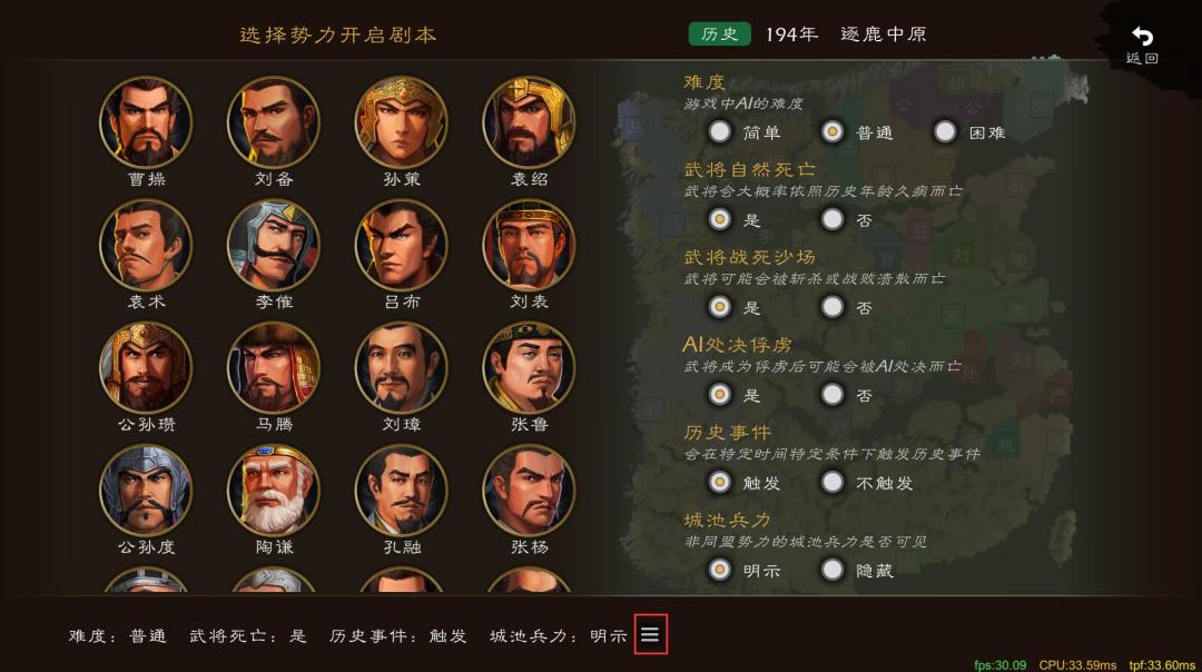 我们收到有不少玩家提出关于武将“死亡”,历史事件、隐藏兵力的反馈。经过深思熟虑,我们在创建剧本时增加了选项,点击最下方的“三道杠”会弹出选择界面,主公们可以根据自己的需求自由选择了~