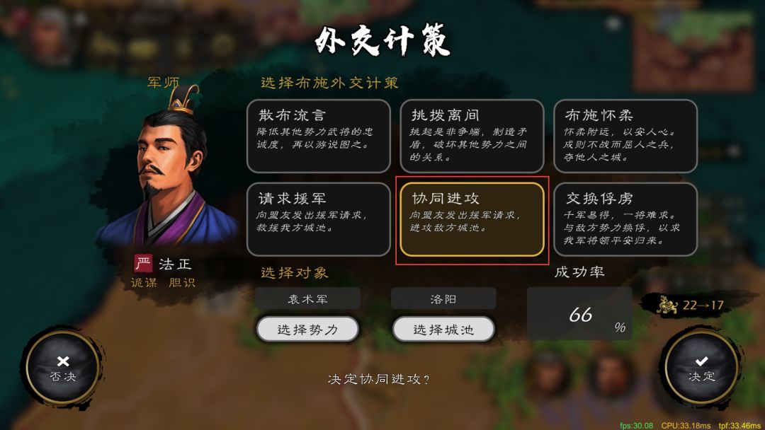 协同进攻是新增加的外交计策,与请求援军同理。可以邀请同盟友军协同攻打敌军某个城池。