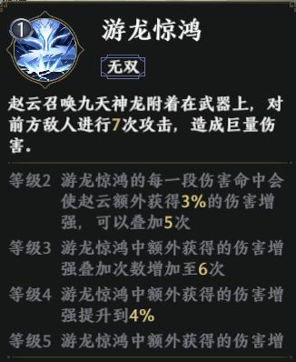 赵云无双技能【游龙惊鸿】,能对前方敌人进行7次攻击,造成巨量伤害。升级后,还会额外获得伤害增强,是非常厉害的输出技能了。