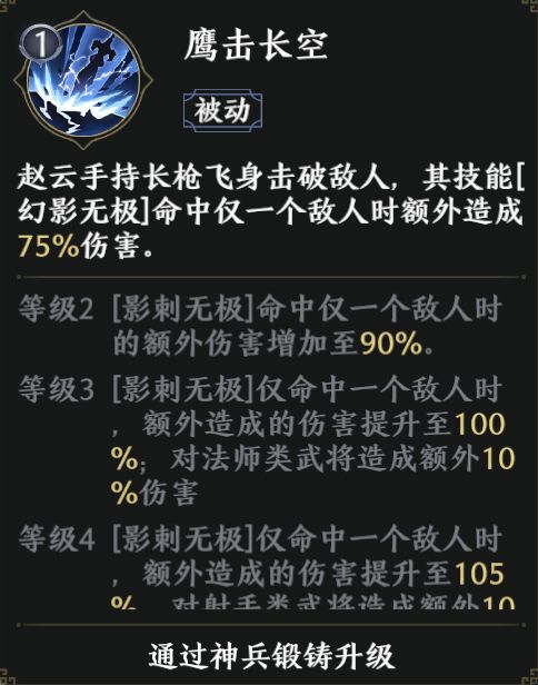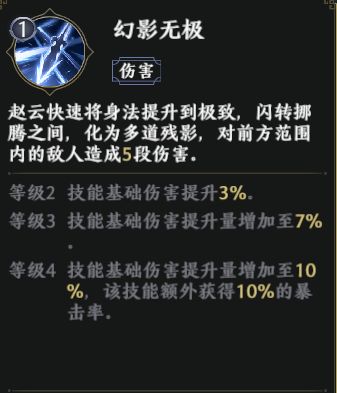 其技能2【幻影无极】能让赵云化为多道残影,并对前方范围内的敌人造成5段伤害。随着技能升级,基础伤害也会获得提升,等级4时还能额外获得10%的暴击率,是非常强悍的输出技能。被动技能【鹰击长空】还能使得【幻影无极】的伤害更上一个台阶。