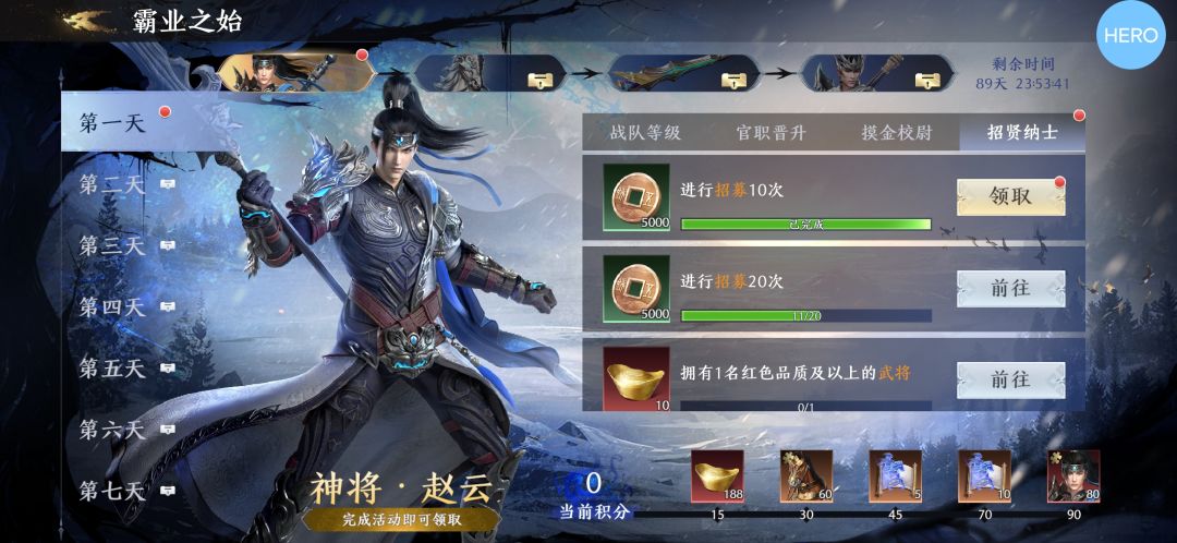 首先,赵云是通过第一期【霸业之始】活动免费获得的,而这个活动是分四期,后面几期活动同样能免费获得专属坐骑照夜玉狮子、神兵外观、专属皮肤。(不过这次测试时间较短,应该体验不到)