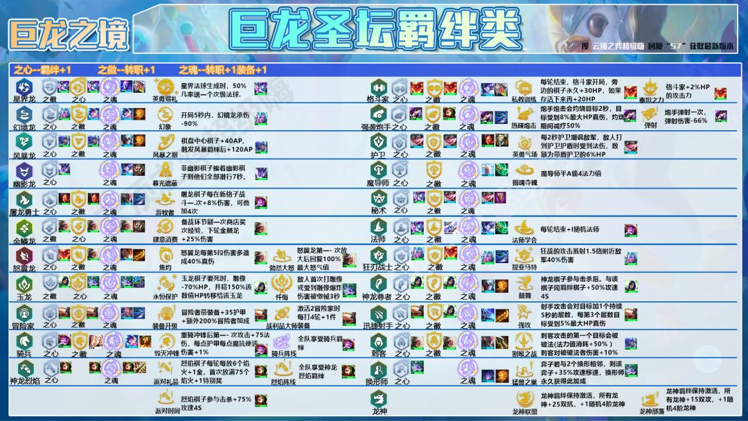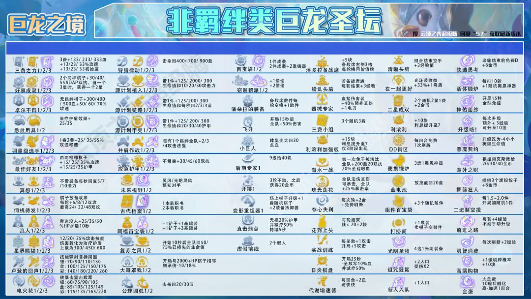 非羁绊类型类型:鼓舞、古代档案、忏悔、永恒保护、便携锻炉、组件百宝袋、利滚利、新人入队、星界赐赐福、急救工具、阿福百宝袋、诅咒冠冕鼓舞:神龙棋子、英豪参与击杀后,与该棋子同羁绊棋子+70%攻速4秒,这个是神龙尊者的专属圣坛,也是这套阵容T0级别的圣坛来了一定要选。阿福的百宝袋:神龙尊者纹章是铲子加大棒来合成,只要有铲子是百分之百能做出神龙尊者纹章的。忏悔:敌人首次攻击一个雕像或者是收到雕像爆炸时被缴械2.5秒,这2.5秒够我们打很多输出了。新人入队:这个圣坛可以让我们不用升9人口,不人口即可成型,但前提条件是有神龙尊者纹章。组件百宝袋:提供三个散件,输出装备给沃利贝尔、防御装备给奥恩。