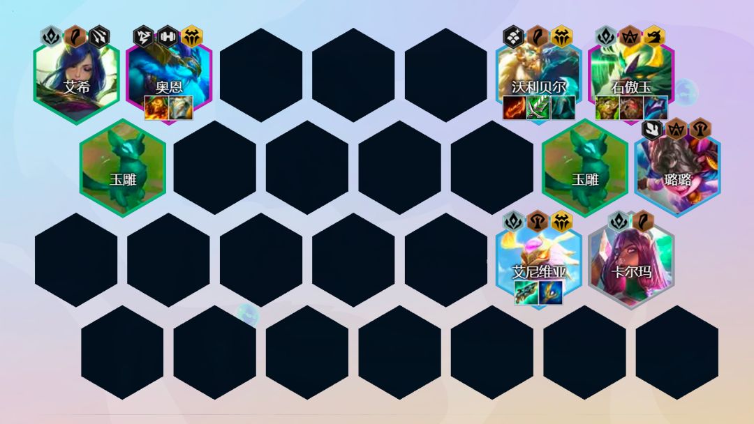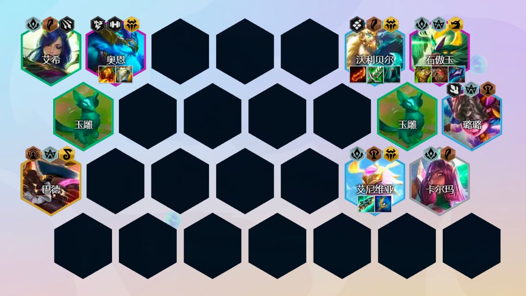 阵容组成:艾希、卡尔玛、璐璐、沃利贝尔、石傲玉、巴德阵容羁绊:6玉龙3神龙尊者3传奇半神3秘术转职推荐:神龙尊者纹章、秘术纹章