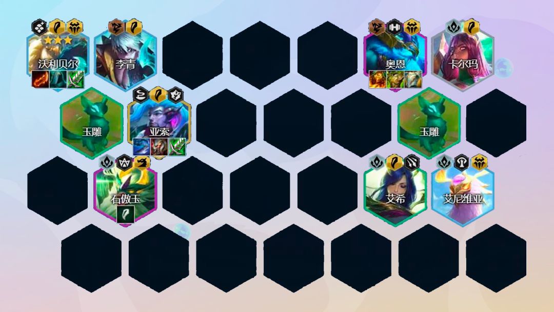 后期阵容:沃利贝尔3星就可以直接考虑拉8人口,8人口找到2星石傲玉和2星奥恩即可。后续9人口补充一个巴德或者娜美开出3秘术羁绊。