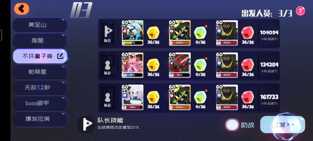 武器;随意 宠物;可以三个小金人 也可二金人一鸡块 方糖;人物总移速尽量控制在5左右(主要是能够更好的躲boss技能)(人物的移速尽量控制在一个数值左右差距不要太大)剩下的可以带生命糖 武器;这里没过多的要求随意就好 主要靠宠物技能打伤害 宠物;对此玩法不熟练的建议小金人生命糖和攻击力糖 然后如果带的有鸡块和云的话带生命糖就行了(这套阵容是无七星 超平民容易获得 )