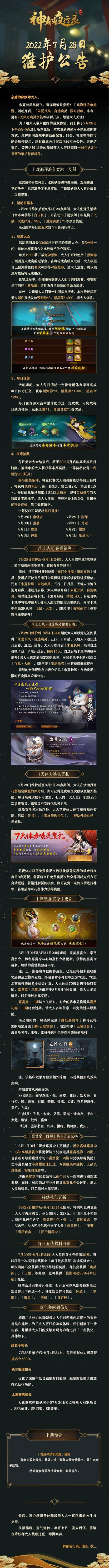 为了给大人带来更好的游戏体验,我们将于7月28日下午2点-5点进行版本更新,本次更新将采用不停服维护的方式,维护期间游戏中的助战配置、门会、社交等功能可能会暂停使用,届时请您关注游戏内的相关公告。维护结束后,等级达到12级的降妖师大人可以领取一封包含3个玉璧的维护补偿邮件。