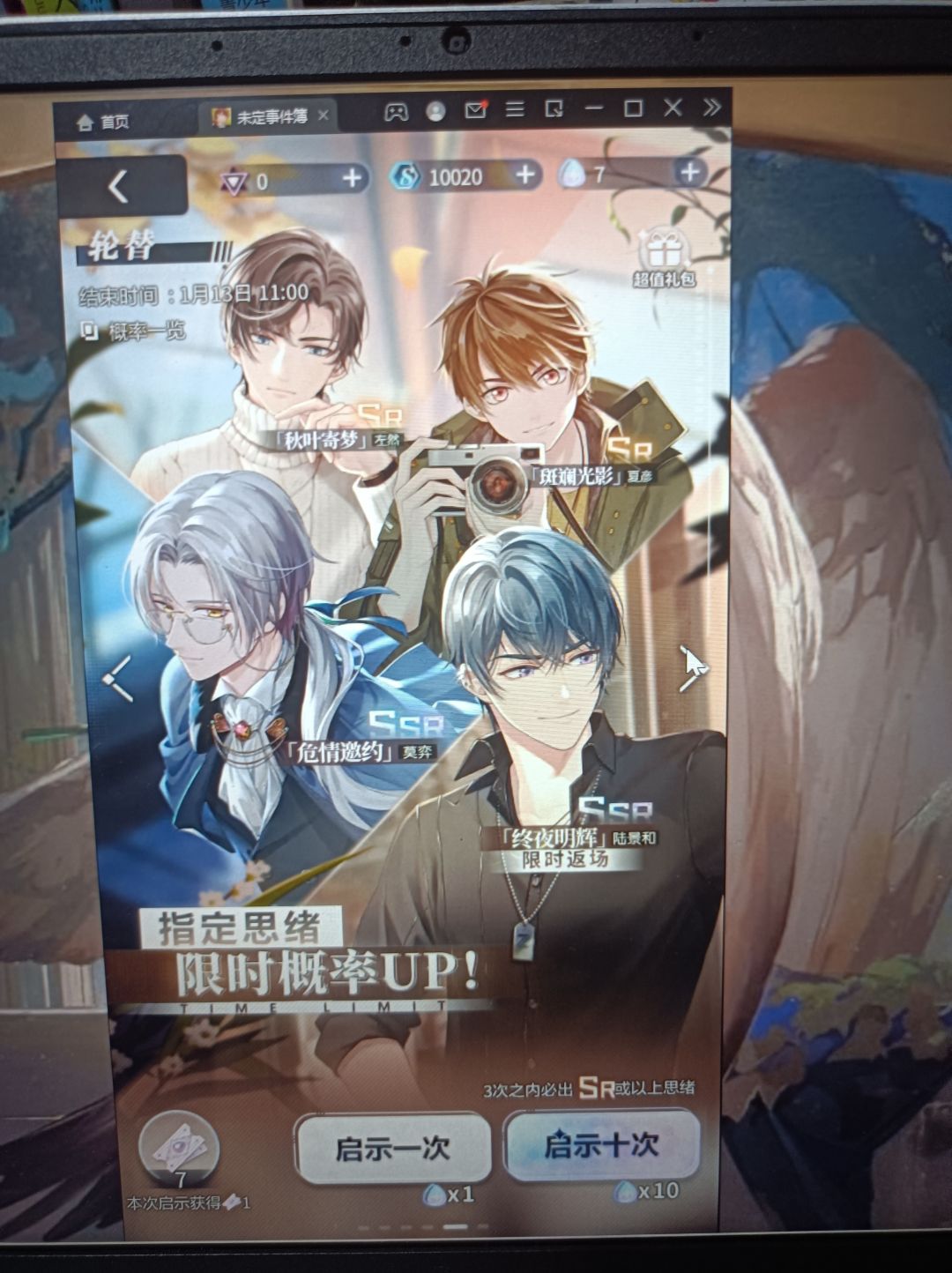 无所谓哥会保底,未定从来没这么痛苦过,最开始看错池子了,免费的十抽直接下了夏彦的,出了张彩,我想着,下错了但十抽就出了一张,也不错,结果歪了,还歪了张我有的。