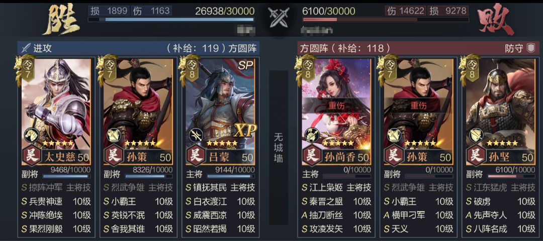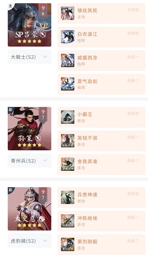 该阵容的基础框架与吴封类似,但更胜两筹。首先保留了太史慈的高频缴械,对连击队克制能力依旧存在,其次加入了SP吕蒙,依靠开场的高额发动率削弱克制主动体系,最后简单加入一个意气自如,对碉堡、老军师这类指挥伤害队伍也形成抵抗能力,因此吴封进阶为“吴三封”。