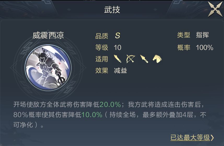 由于队伍对连击、主动都有一定的控制效果,SP吕蒙实际上并不需要搭配过多减伤技能,威震西凉60%的减伤足矣,另一栏位可以考虑搭配其他功能性技能。