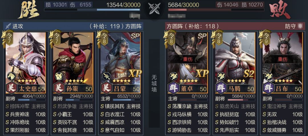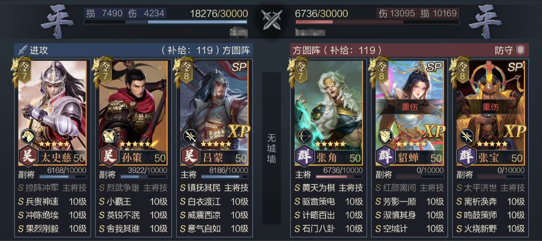 在全体克制的同时,该阵容并没有因为分散克制而失去应有的强度,首先孙策+太史慈的组合有不错的突破效率,配合队内控制与减伤技能有一定持续战斗能力,不过该阵容缺乏输出加成,在面对某些防御较高的阵容时表现不佳,建议主要用于克制承受低、爆发高的连击队伍或主动队伍。