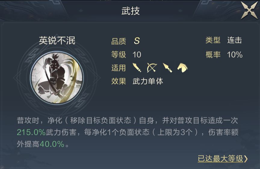 太史慈和常规吴封定位一致,冲陈绝埃属于固定配置不建议替换,另一技能可以考虑果烈刚毅提升AOE能力和缴械附加频率。