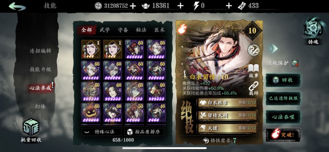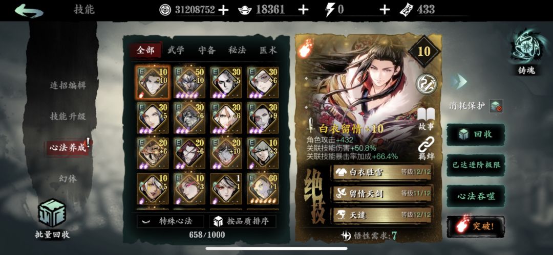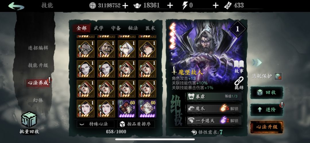 这个号是五月15号开始玩的前期一定要加个活跃公会换沉思之人,憋足元宝等魔堡心法池抽到紫五火。培养烈火和千机压下一紫龙技能CD。邪后随缘,千机好培养。把多余的心法分解优先换白剑红一火,装备词条地面暴击伤害优先。后期在攒狂龙紫五火肯定会有更大的提升。日常刷图就用第三张链子秒过。