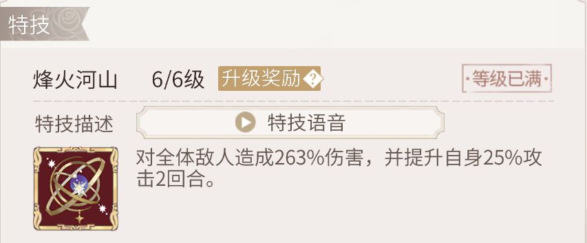 特技自增伤幅度一般(5%~25%),理论伤害26155(T1),对减益增伤后30340(T0),伤害很高但需要队友提供减益。