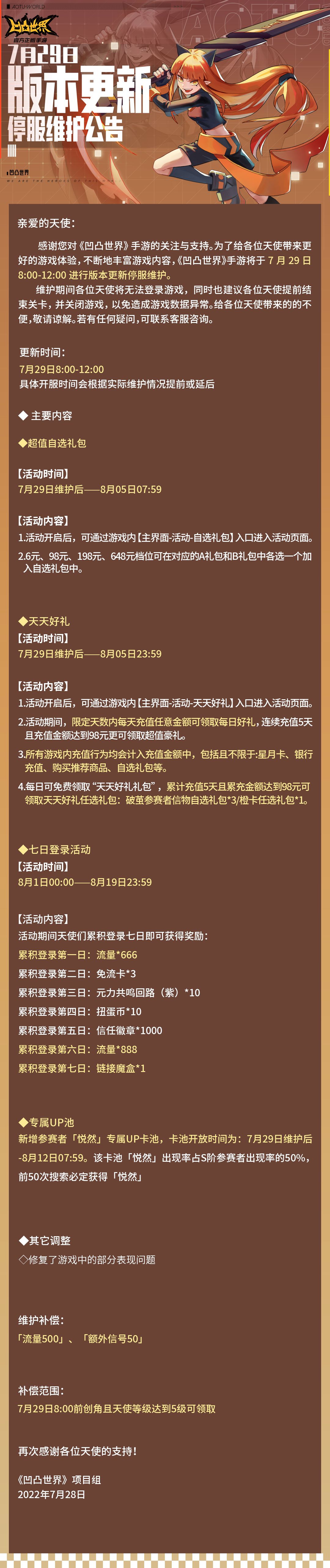 感谢您对《凹凸世界》手游的关注与支持。为了给各位天使带来更好的游戏体验,不断地丰富游戏内容,《凹凸世界》手游将于7月29日8:00-12:00进行版本更新停服维护。